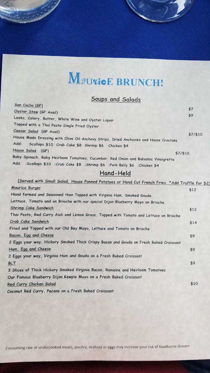 Maurice offers a thoughtfully curated menu that blends refined dining with approachable comfort. The selection ranges from small plates perfect for sharing—like the Croque Monsieur Eggroll or Bacon Wrapped Scallops—to hearty entrees such as the Stuffed Lobster and Eastern Shore Paella. Whether you're stopping in for a casual bite, a relaxed brunch, or a more intimate dinner, the dishes are crafted to complement the warm and inviting atmosphere of this restaurant and inn.